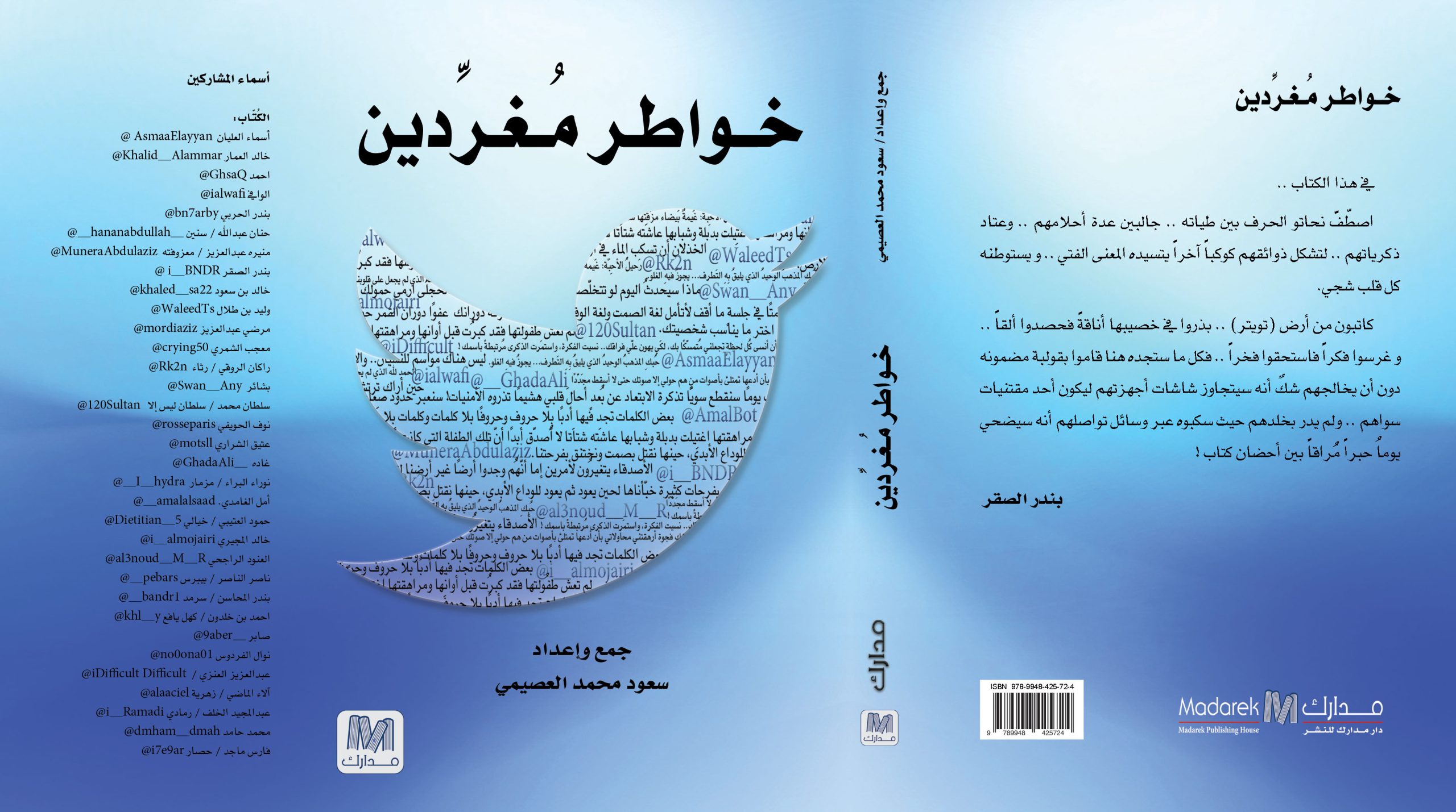 فى هذا الكتاب اصطف نحانو الحرف بين طياته جالبين عدة احلامهم وعناد ذكرياتهم لتشكل ذوائتهم كوكباً بتسيده لمعنى لفنى ويستوطنه كل قلب شجى. كاتبون من ارض تويتر بذور فى خصيبها اناقة فحصدوا الفا، وغرسوا فكرا فاستحقوا فخرا. فكل ما ستجده هنا قاموا بقولبة مضمونه دون ان يخالجهم شك انه سيتجاوز شاشات اجهزتهم ليكون احد مقتنيات سواهم ولم يدر بخلدهم حيث سكبوه عبر وسائل تواصلهم انه سيضحى يوما حبرا مراقا بين احضان كتاب!