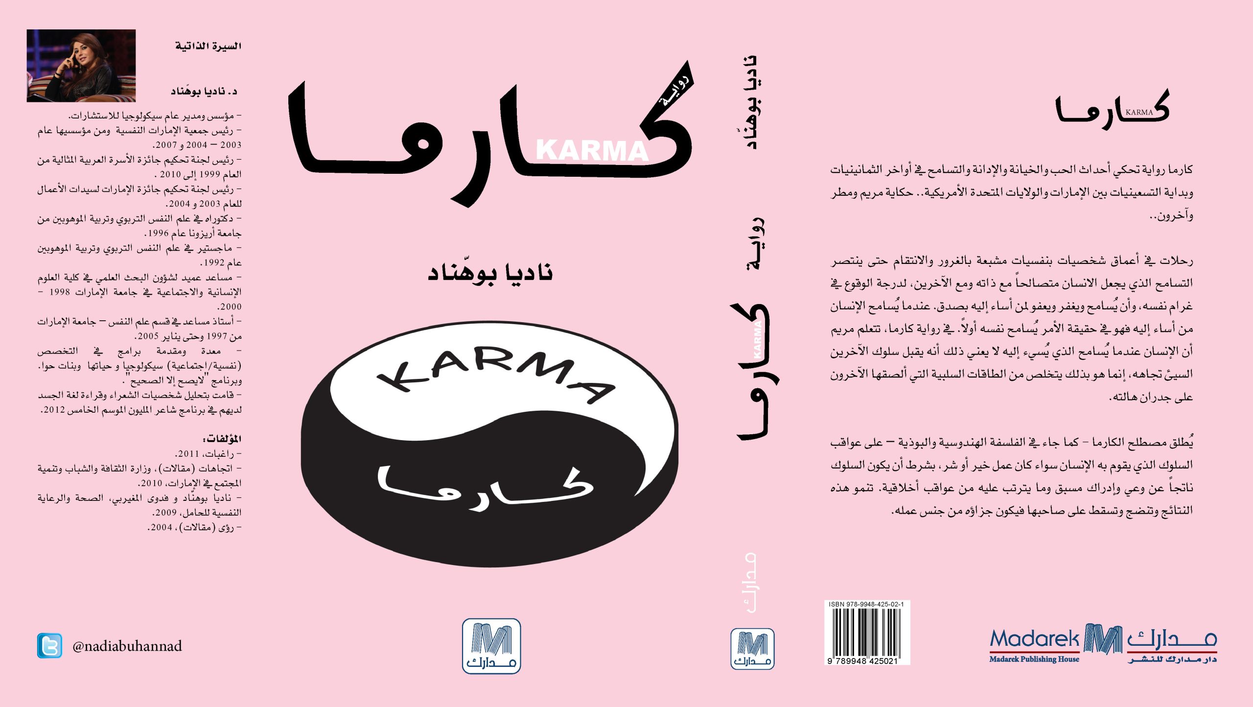 “كارما” رواية تحكي أحداث الحب والخيانة والإدانة والتسامح في أواخر الثمانينيات وبداية التسعينيات بين الإمارات والولايات المتحدة الأمريكية.. حكاية مريم ومطر وآخرون.. رحلات في أعماق شخصيات بنفسيات مشبعة بالغرور والانتقام حتى ينتصر التسامح الذي يجعل الانسان متصالحاً مع ذاته ومع الآخرين، لدرجة الوقوع في غرام نفسه، وأن يُسامح ويغفر ويعفو لمن أساء إليه بصدق. عندما يُسامح الإنسان من أساء إليه فهو في حقيقة الأمر يُسامح نفسه أولاً. في رواية كارما, تتعلم مريم أن الإنسان عندما يُسامح الذي يُسيء إليه لا يعني ذلك أنه يقبل سلوك الآخرين السيئ تجاهه, إنما هو بذلك يتخلص من الطاقات السلبية التي ألصقها الآخرون على جدران هالته. يُطلق مصطلح الكارما – كما جاء في الفلسفة الهندوسية والبوذية – على عواقب السلوك الذي يقوم به الإنسان سواء كان عمل خير أو شر، بشرط أن يكون السلوك ناتجاً عن وعي وإدراك مسبق وما يترتب عليه من عواقب أخلاقية. تنمو هذه النتائج وتنضج وتسقط على صاحبها فيكون جزاؤه من جنس عمله.